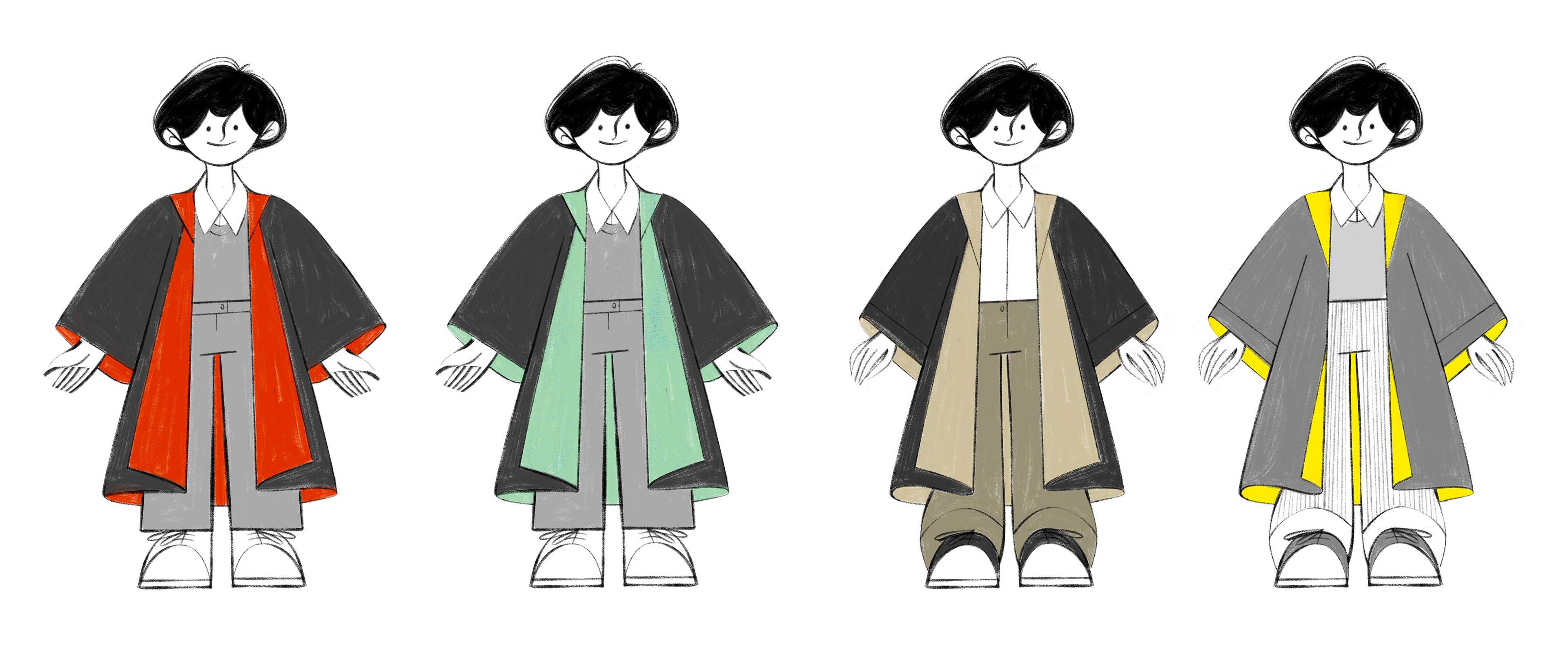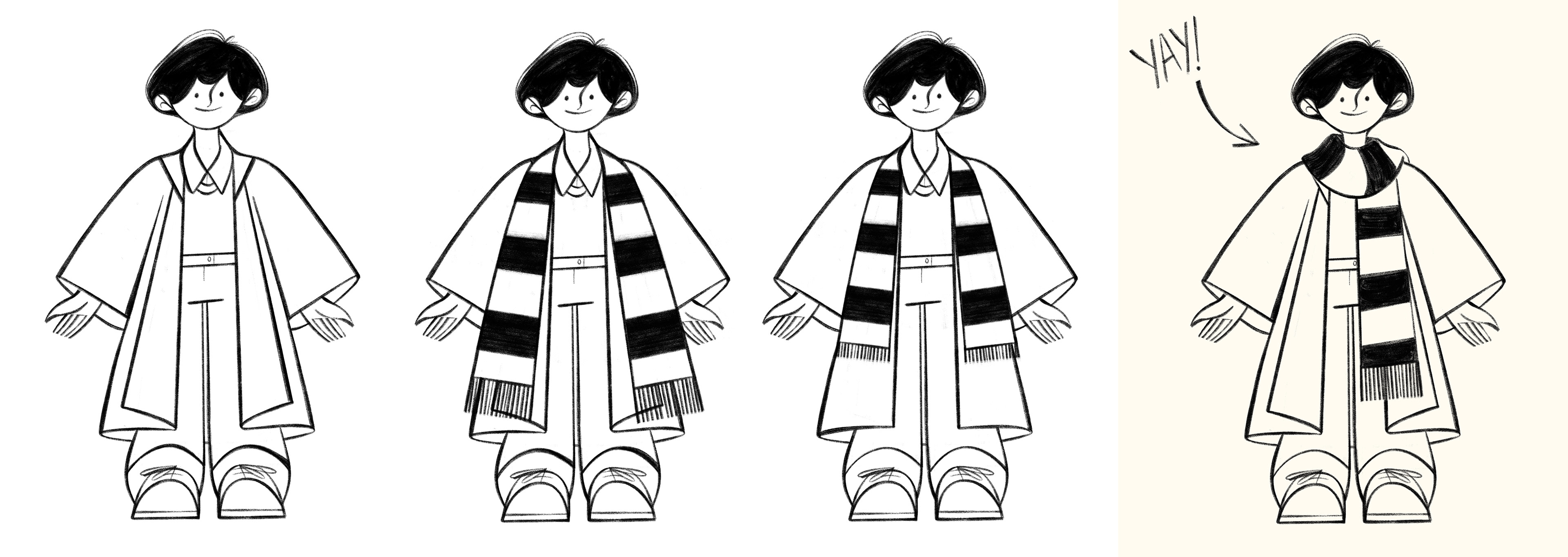 At this point we were not sure about the scarf yet, and wanted to see how it worked in action, so all concepts had a with and a without scarf version.
